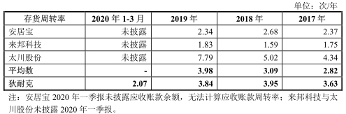 2016年至2020年3月31日,公司存货周转率分别为3.37、3.63、3.95、3.84、2.07。2017年至2019年,同行业可比公司存货周转率均值分别为2.82、3.09、3.98。