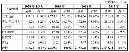 报告期内,研发费用中职工薪酬金额分别为1760.95万元、2170.45万元、1824.76万元、1758.41万元、453.11万元,占研发费用的比例分别为75.55%、82.10%、84.65%、76.46%、84.98%。