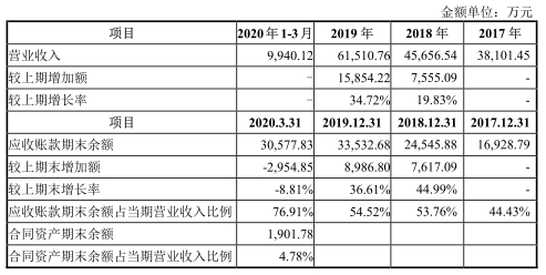 2017年至2020年3月31日,公司应收账款逾期金额3812.39万元、5919.79万元、6469.59万元和6319.72万元,逾期应收账款比例22.52%、24.12%、19.29%和20.67%。