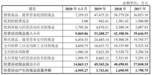 此外,报告期各期,随着公司业务规模的扩大,各期末应收账款和存货规模亦呈上升趋势,对公司流动性资金的占用较大,2017年至2019年各期末存货和经营性应收项目两项合计增加额各期分别为6958.90万元、1.11亿元和1.95亿元,进而导致经营性现金流净额低于当期净利润水平。