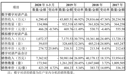 公司数字楼宇对讲产品降价促销。报告期内,公司数字楼宇对讲产品销售单价下滑,分别为618.81元/套、555.50元/套、530.71元/套、469.76元/套、466.28元/套。数字楼宇对讲产品销量提升,分别为22.55万套、36.43万套、56.18万套、93.25万套、13.49万套。