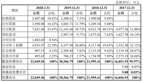 公司称,2018年末和2019年末分别较上年末增长36.98%和38.97%,主要是随着公司生产经营规模的逐步扩大以及资产总额的稳步增长,公司负债规模亦持续扩大;2020年1-3月,公司支付了较多的应付账款、应付职工薪酬和应交税费,使得期末负债规模下降。