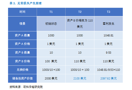 T3时刻,套利者向该智能合约注入481份资产A,换取0.47份资产B。套利结束后,资产A有1048.81份,资产B剩余9.53份,此时储备池内资产总价值为1048.81*1+9.53*110=2097.62美元,相较于套利前少了2.38美元,这部分损失即无常损失。