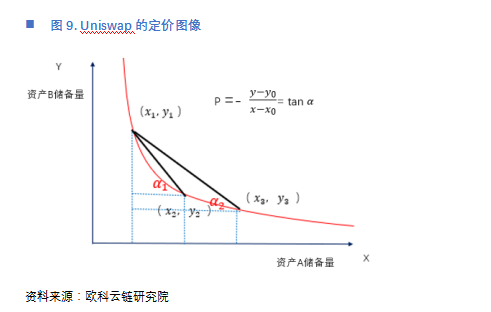以Uniswap为例,在上文中我们提到,交易前智能合约内两种资产的数量为(X0,Y0),交易后变为(X, Y),那么其实际交易价格为(这里我们忽略交易费用):