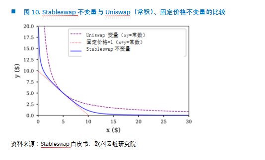 2. 交易深度的改善方案以Uniswap为代表的AMM为例,从模型上看,由于其采用恒定乘积模型(x*y=k),导致其滑点过高,当然好处是理论上可以为交易提供无限的流动性(x,y永远不会等于0)。那么什么样的模型可以实现零滑点问题呢?---恒定总和模型。以x+y = k为例,从图像上看,其兑换价格恒定为1(即图像的斜率恒为1,然而这样带来的缺陷是很容易耗尽储备池的资产。因此,一种理想的方式是构建一种混合函数,如果两种资产的价格相对稳定,就可以降低函数中的滑点值;当储备池中的资产流动性不足时,则迅速提高价格,实现理论上的无线流动性,而Curve构建的恒定函数模型StableSwap正是此类中的佼佼者,为此构造了一个复杂的函数:
