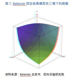 R 是每种资产的储备量,W 是每种资产的权重,k 是常数。从图像上看,Balancer将原来的二维双曲线扩展至多维,下图即在三维下的恒定值曲面图像。