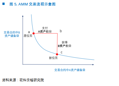 从图像上看这一交易过程更为简洁:因为k是一个固定的常数,所以两种资产的数量x和y只能在下图中的反比例函数图像上运动。开始时(x,y)在图中的a点,当交易者向智能合约打入A资产时,(x,y)的坐标来到b点;为了使(x,y)回到反比例函数图像上,必须减少B资产的数量,随后(x,y)运动到了新位置C,并完成交易。