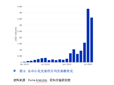 在金融市场交易制度日益复杂的今天,自动化做市商机制以x* y = k这样一个简洁的模型横空出世。自6月至今,CFMM类的去中心化交易所在以太坊上迅速崛起,其月均交易额从年初的不足5亿美元迅速上升至目前的40亿美元。特别是Uniswap,其日均交易额突破1亿美元,超越了许多中小型交易所,达到美国最大加密资产交易平台Coinbase日均交易量的三分之一,这印证了中国古代的哲学智慧----大道至简。