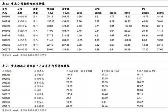 重点关注公司中,2020年7月,乘用车板块,比亚迪、吉利汽车、长安汽车分别上涨18.93%、33.61%、0.64%,江淮汽车下跌2.54%;商用车板块,中国重汽上涨了17.02%;零部件板块,汽车智能化标的德赛西威、保隆科技、宁波高发以及新能源及特斯拉产业链标的三花智控、银轮股份以及拓普集团等涨幅明显,德赛西威涨幅15.59%,银轮股份涨幅21.08%,三花智控涨幅23.21%,宁波高发涨幅23.40%,拓普集团涨幅16.64%,岱美股份涨幅18.92%,新坐标涨幅17.08%;汽车服务板块,安车检测涨幅69.66%,易鑫集团涨幅1.97%。