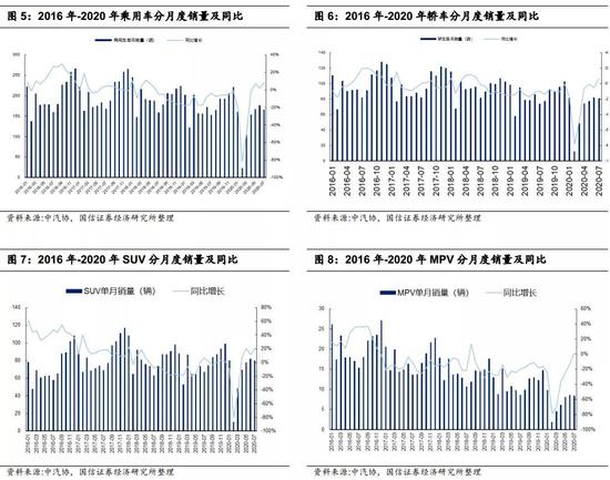 2020年7月乘用车产量销量同比分别增长13.2%和8.5%。根据中汽协数据,2020年7月,乘用车产销分别完成172.9万辆和166.5万辆,环比分别下降3.9%和5.6%,同比分别增长13.2%和8.5%。其中,因为7、8月份是汽车销售淡季,所以本月汽车产销均有所下滑。从细分车型来看,4类车型产量全部增长,销量中仅MPV销量同比下降,其他车型销量均呈现增长。7月乘用车高增长主要由于去年同期国五国六排放升级切换带来的低基数的原因造成。