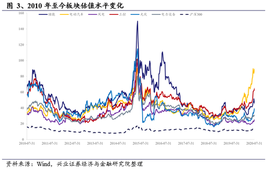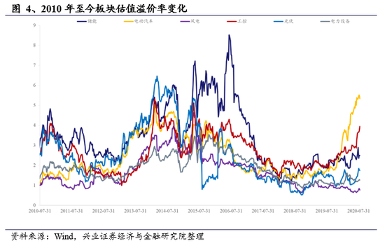 截至2020年8月14日,沪深300估值为13.83倍(TTM整体法,剔除负值),储能板块、电动汽车板块、电力设备板块、风电板块、工控板块、光伏板块市估值分别为48.18、87.66、31.29、24.42、68.44、38.03;对于沪深300的估值溢价率分别为2.48、5.34、1.26、0.77、3.95、1.75。
