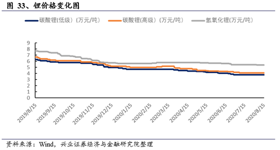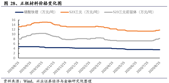 电池材料价格整体处于下降通道,正极材料占比最大,价格下降幅度较大,有利于电池环节成本优化。