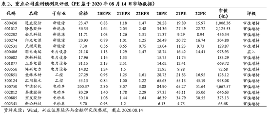 ●通威股份:硅料格局保障价格体系,公司成本处于第一梯队,进口及落后产能双重替代,叠加技术及资金壁垒,盈利能力处于领先水平。电池成本优势显著,高效产品溢价,盈利能力超预期。我们预计公司2020-2022年EPS分别为0.83、1.18和1.47元,对应2020年8月14日收盘价的PE分别为28.28、19.89和15.97 倍,维持审慎增持评级。