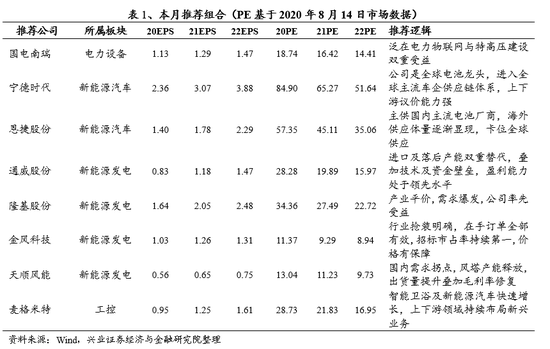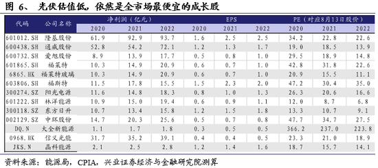 下表为兴业证券电力设备新能源组核心推荐及重点关注的A股上市公司及其盈利预测情况。