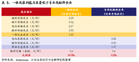 1、组件一线企业一体化战略,拉开与二线专业化组件企业盈利差距。根据当前时点价格测算(硅料95元/kg,电池0.95元/W,组件1.6元/W),一体化组件企业毛利率为14.5%,而专业化组件企业为3.2%。若考虑龙头企业在硅片、电池、组件等非硅成本优势,则龙头组件企业毛利率有望达到15%以上。