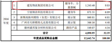 与此同时,招股说明书又在“主要成品采购供应情况”中显示,2016年,舒华体育向建发物流集团的采购内容为健身车和力量器械,采购金额为1243.4万元;