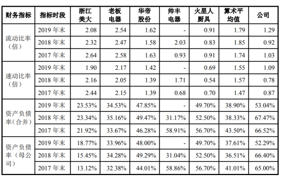 不过,亿田股份的资产负债率仍高于同行业公司,流动比率、速动比率低于同行业公司。2016年至2019年各期末,同行业公司的合并资产负债率均值分别为34.46%、43.50%、38.33%和38.90%,流动比率均值分别为2.63、1.74、1.85和1.79,速动比率均值分别为2.35、1.47、1.57和1.55。