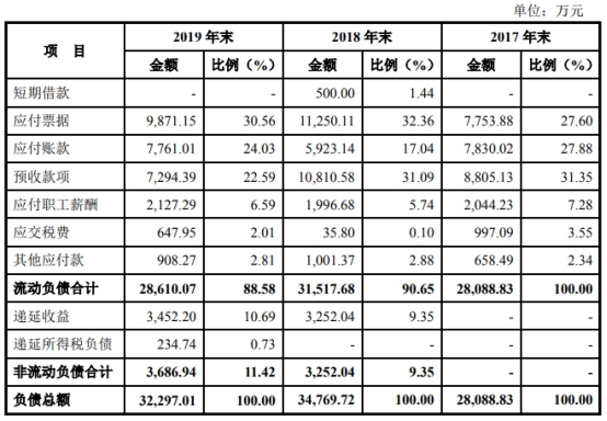 招股书显示,2016年至2019年末,亿田股份的负债合计2.43亿元、2.81亿元、3.48亿元和3.23亿元,整体呈现上升趋势。短期借款、应付票据、应付账款和预收款项四项合计占负债总额的比例分别为87.91%、86.83%、81.92%和77.18%。