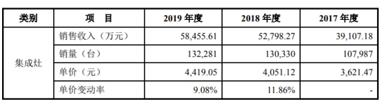 亿田股份称,受益于中高端集成灶产品销售占比逐年提高,公司集成灶单价也同比上升,由2016年的3428.48元/台增至2019年的4419.05元/台。