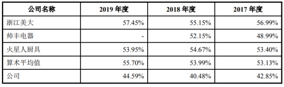 在众多竞争对手环伺下,2016年至2019年,亿田股份的集成灶产品毛利率分别为43.97%、42.85%、40.48%和44.59%,而2016年至2019年,浙江美大等同行业可比公司的毛利率均值分别为51.91%、53.13%、53.99%和55.70%,各期超出亿田股份毛利率约10个百分点。