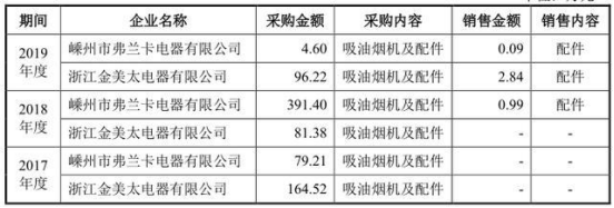 据招股书,2018年至2019年,亿田股份曾向供应商嵊州市弗兰卡电器有限公司(下称“弗兰卡电器”)、浙江金美太电器有限公司销售配件,并且解释称,此举是为了确保产品质量稳定和管理效率的考虑,才将供应商生产所需的配件销售给该等供应商。