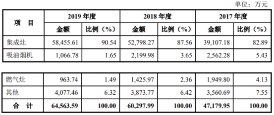2016年至2019年,亿田股份集成灶产品收入占主营业务收入的比例分别为76.07%、82.89%、87.56%和90.54%,产品集中度较高并且呈现逐年上升态势。北京中怡康时代市场研究有限公司的数据显示,2019年度亿田股份的集成灶产品市场占有率为6.30%。
