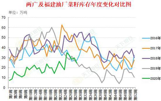 菜籽方面,截止7月17日当周,国内沿海进口菜籽总库存下降至24.4万吨,较上周的29.7万吨减少5.3万吨,降幅17.85%,较去年同期的44.9万吨,降幅45.66%。其中两广及福建地区菜籽库存下降至24.4万吨,较上周29.7万吨降幅17.85%,较去年同期27.3万吨降幅10.62%。中加关系紧张导致菜籽进口不畅,但陆续还有一些加籽船到。根据Cofeed统计,7月有19万吨加籽和3万吨澳籽到,8月有30万吨加籽到。预计需要中加紧张关系缓解后,国内企业才会大量买入新的加籽船,目前只有少数民营企业及个别外资还有菜籽到港。5月28日凌晨加拿大法院公布第一个判决,孟晚舟未能获释,将留在加拿大参加后期的相关听证,加上加拿大跟随美国对香港实施国安法进行无端制裁,中加关系紧张局面未缓和,及中澳关系也不乐观,后续菜籽进口量或继续受影响。菜籽的持续性走强,外溢效应,预计也会对豆油形成共振。