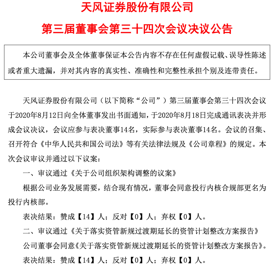 8月18日,天风证券董事会审议并通过了《关于落实资管新规过渡期延长的资管计划整改方案报告》。这是资管新规过渡期延长后,第12家通过新的资管业务整改方案的券商。