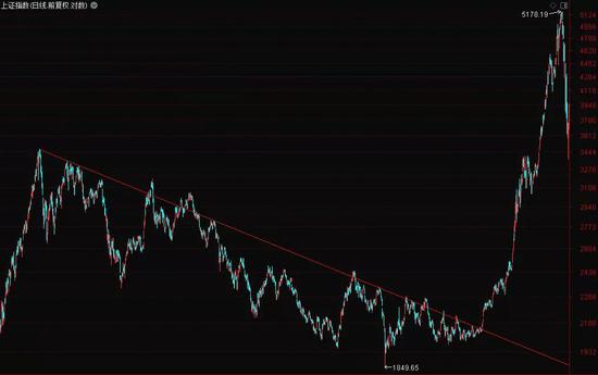 一个重要的现象是,今天沪指盘中最高点触及长期压力线。这条压力线是从2015年底的顶点起步,时间跨度近5年。我们来看看2014年底突破的长期压力线时间跨度是多少年,掐指一算,恰好也是5年。