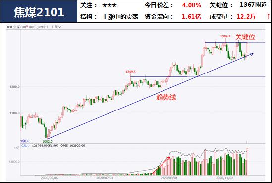 2.盘面:焦煤整体高位区间调整,今日大幅拉升,冲击区间上轨。