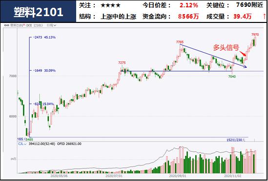 11月即将结束,目前市场对PP和塑料维持强势感到乐观,当前两油库存处于低位,下游需求从短期看相对火爆,但需求方面也已经出现了边际递减趋势,特别是随着市场价格的大幅增长,下游工厂对高价货源持抵触心理。盘面看,塑料和PP延续强势,今日新高收盘,上涨趋势明显。多单可持有,若再次拉升新仓可轻仓试多跟随。