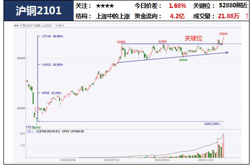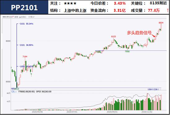 商品整体延续多头趋势,今日商品指数创阶段新高。能化板块延续强势,PP塑料领涨,沥青等品种跃跃欲试;黑色系受降温影响盘面有小幅回调,但韧性仍在,仍要关注调整幅度,等待多头信号;有色品种近期受资金追捧,炒作顺周期的氛围下,价格不断走高,目前仍是多头思路对待,多单可持有;农产品仍是多头思路,今日双粕领涨,白糖拉升,油脂虽有回调,但上涨结构仍在。商品结构为上涨中的上涨。