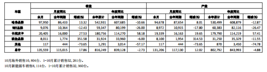 从前10月销售数据来看,哈弗品牌仍为长城汽车贡献了大部分的销量,皮卡则为公司贡献了大部分的增量,公司新能源汽车销量及同比数据均不理想。