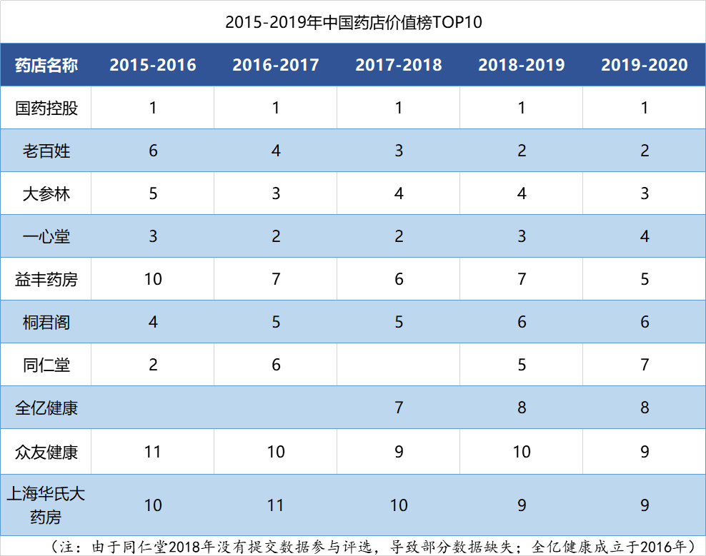 2014-2017年,4大连锁药房接连上市。在最新的榜单中,除了国大药房仍然位居榜首以外,桐君阁、同仁堂已经被挤出前五,成大方圆甚至已经跌出前10,4大民营连锁药房已经完全占据TOP5的其余席位。