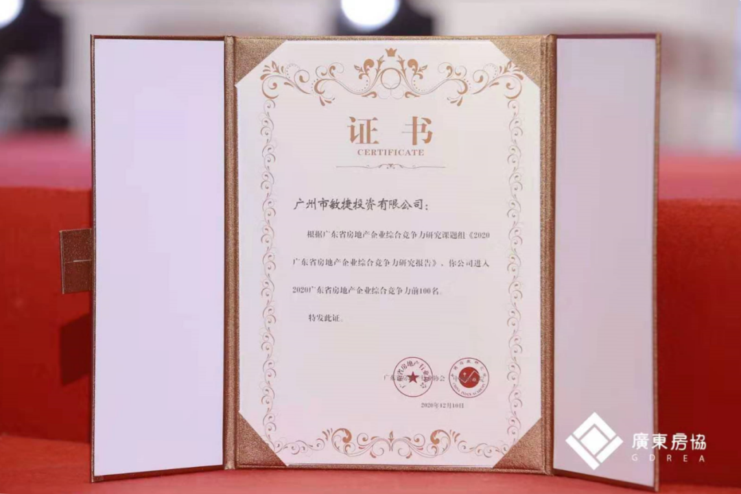 (2020广东省房地产企业综合竞争力前100名证书)