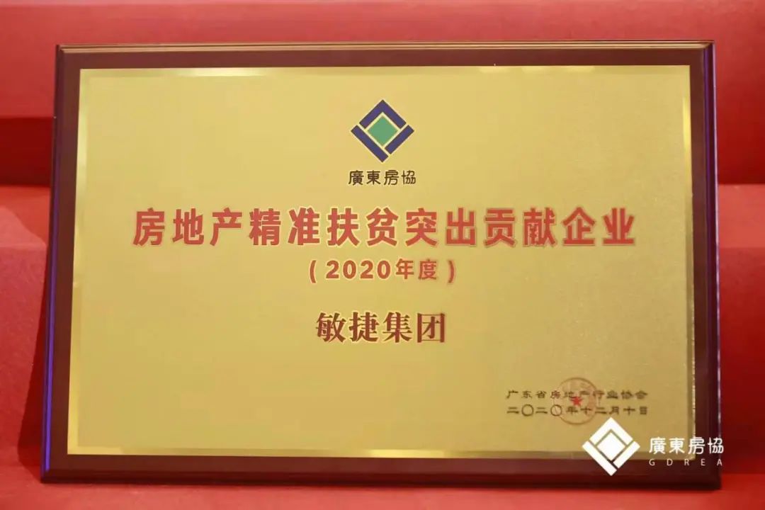 砥砺前行新时代,脱贫攻坚有作为。凭借在社会责任、脱贫攻坚领域的突出表现,敏捷集团被授予“2019年度广东省房地产社会责任先进企业”、“2020年度房地产精准扶贫突出贡献企业”称号。