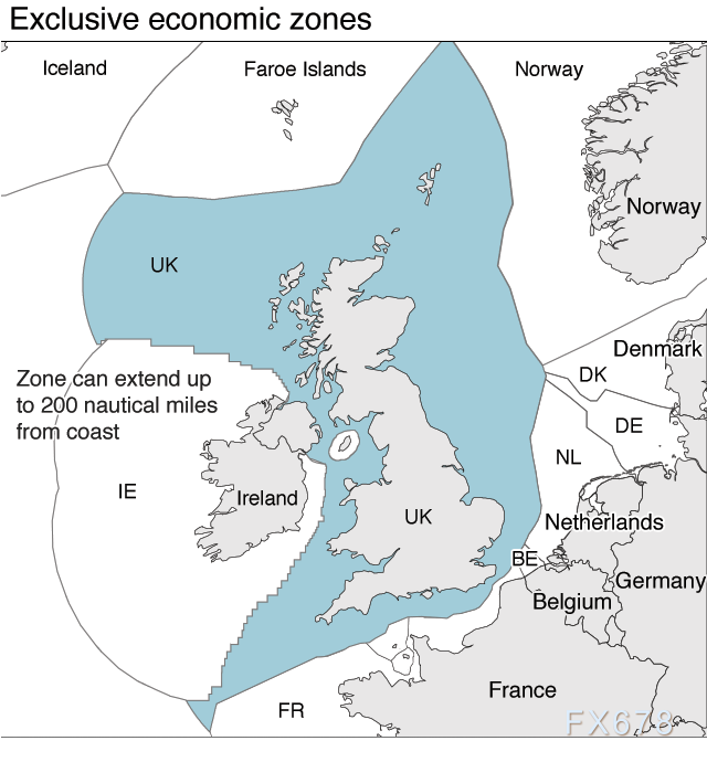 在欧盟内部,所有成员国的专属经济区作为共同资源共同管理在欧盟之外,作为一个“独立的沿海国家”,英国将控制北大西洋200海里范围内的专属经济区(EEZ)。英国将很快控制谁可以在其水域捕鱼。
