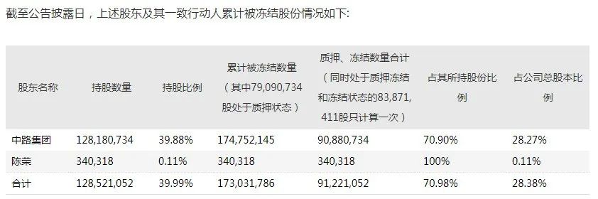 而根据其12月8日发布的公告来看,在这一连串“糖葫芦式”的冻结之下,中路集团及其一致行动人累计质押、冻结的上市公司股份达9122万股,占中路集团及其一致行动人所持上市公司股份的70.98%,占上市公司总股本的28.38%。