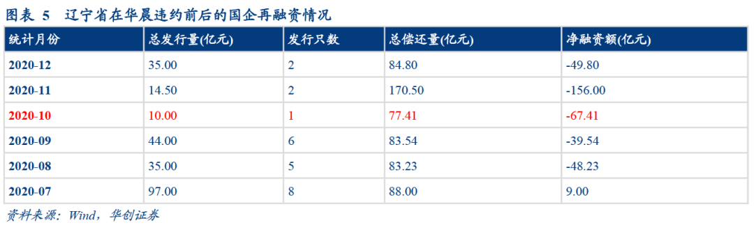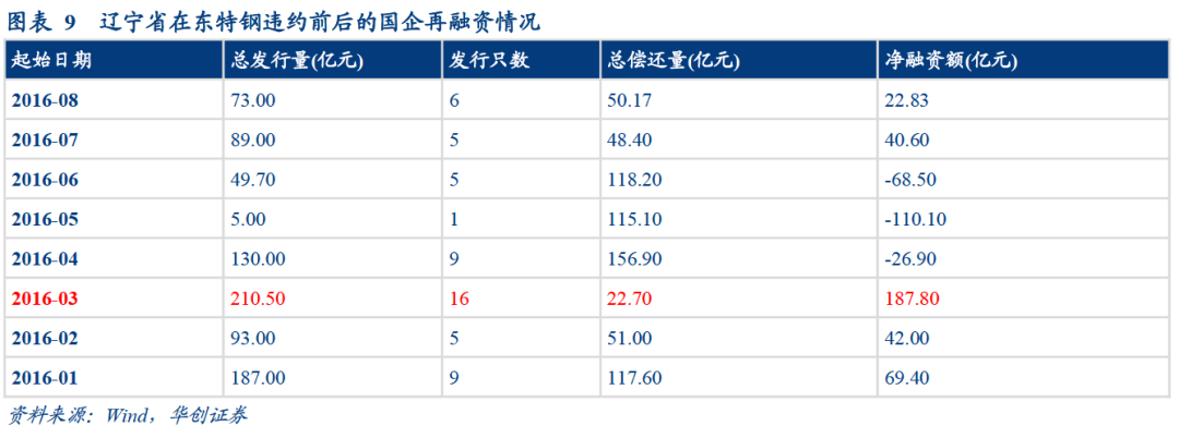 根据下文中我们选取的华晨、青海盐湖、川煤炭、桂有色、东特钢等案例的违约前后区域再融资复盘,一般在企业违约后的3个月左右,区域的净融资额会转正。