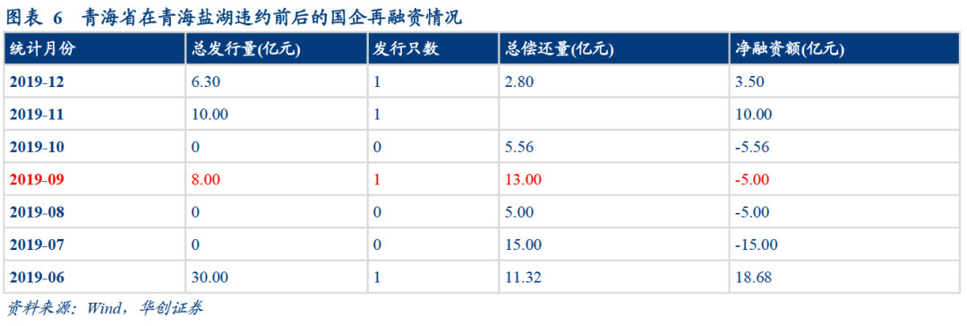 青海盐湖于2019年9月30日违约,为青海省重要的地方国企,违约当日存量债券总额61.74亿元,为历史上首单发行时主体评级AAA的地方国有企业违约。青海盐湖违约后第一个月青海省无新发行债券,违约后第二个月出现新发行债券。2019年11、12月青海省发行主体分别为:AAA的城投平台西宁经济技术开发区投资控股集团有限公司、AA+的地方国企西部矿业集团有限公司。