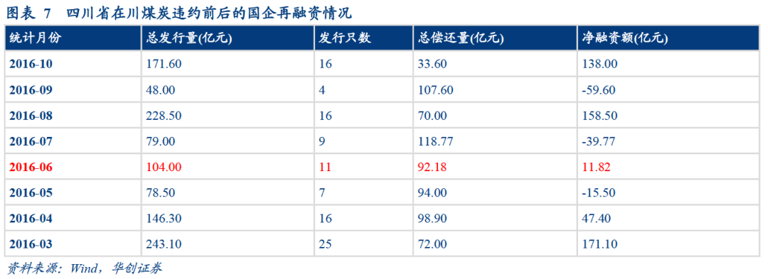 川煤炭于2016年6月15日违约,为四川省重要的地方国企,存量债券总额为47.50亿元,发行时主体评级为AA+。川煤炭违约后第一个月,四川省国企债券净融资额转负,其后第二个月净融资额转正。