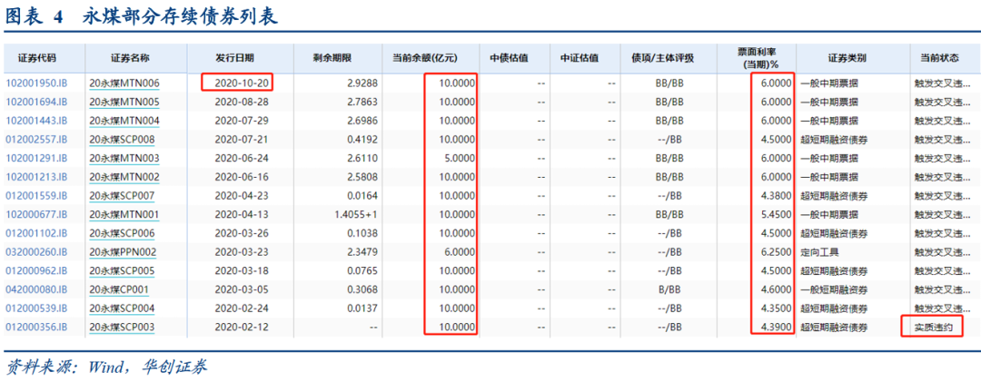 4、违约前上一个月依然正常发债:永煤是极少数违约前上一个月债券发行依然正常的企业。无论发行是否足够市场化,违约前的半年度存在如此大量的债券发行,也充分体现了其并未发生极严重的再融资困难。