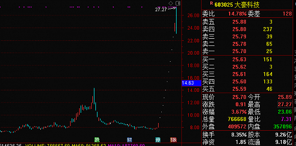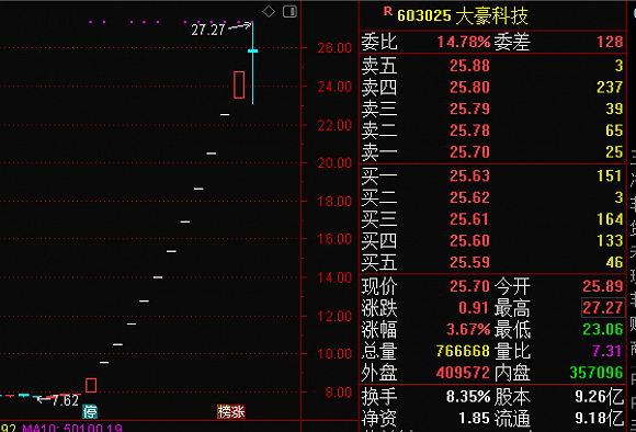 受此刺激,大豪科技开启“飞行模式”,从11月23日至12月23日,共计13个交易日里累计涨幅232.41%,最大上涨243.88%。这期间的12月8日至12月21日,大豪科技还录得10个“一字涨停”,直到12月22日才出现换手,当天换手率9.8%,12月23日换手率10.46%。