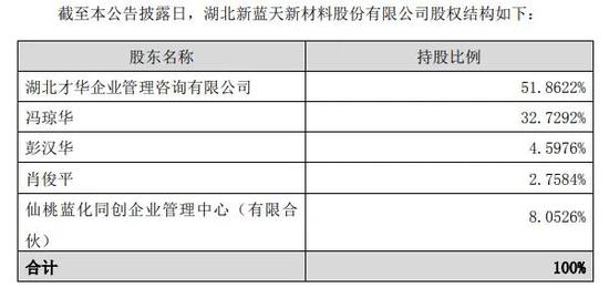 股权结构来看,湖北新蓝天控股股东为湖北才华企业管理咨询有限公司,其持有湖北新蓝天约52%的股权。湖北新蓝天其他股东还包括冯琼华、彭汉华、肖俊平等。