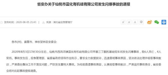 针对8?3仙桃化工企业闪爆事故,今年8月4日“仙桃发布”微博曾经发文称,蓝化有机硅已全面停产整顿,相关部门正对事故展开全面调查。
