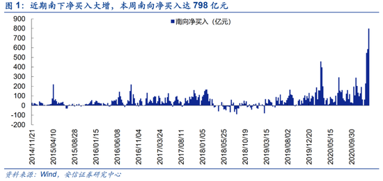 本周与投资者交流,港股成为了许多投资者关心的话题。也有投资者将南下资金大量流入港股视作A股估值太贵的标志。我们认为,南下资金汹涌的主要原因是香港市场风险偏好的改变和内地权益市场流动性的溢出。而A股市场目前充裕的流动性意味着行情不会在近期结束。