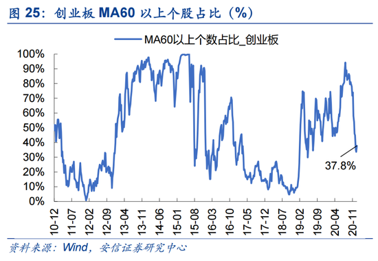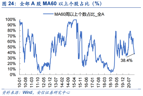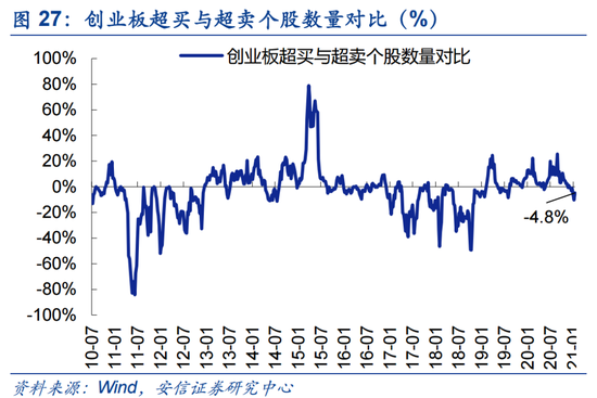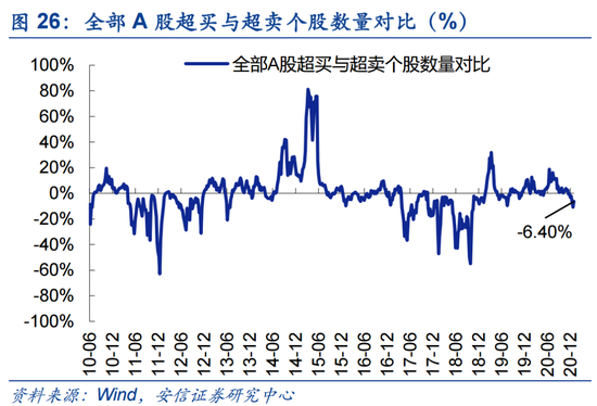 本周盘面分化有所缓解。当前市场强势个股数量占比38.4%,较上周回升1.0个百分点;超买个股与超卖个股之差占比-6.4%,较前周大幅回升4.3个百分点。创业板来看,强势个股数量占比37.8%,较上周大幅回升4.1个百分点;超买个股与超卖个股之差占比-4.8%,较前周大幅回升5.5个百分点。