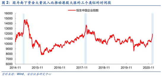 从历史上看,类似的A股处于阶段性高位、南下资金大量流入港股、恒生中国企业指数快速上涨的时间段共有三次:
