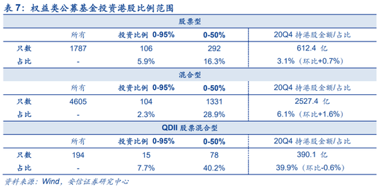 当前内的公募基金配置港股比例较少,但近两个季度以来正在快速上升。我们统计发现,当前公募基金中能够投资港股的比例达到95%的基金数量占股票型基金的5.9%,占混合型基金的2.3%;能够投资港股的比例达到50%的基金数量占股票型基金的16.3%,占混合型基金的28.9%。同时,基金持有港股占净值的比例也从去年年中的3.58%快速上升至年末的5.75%。