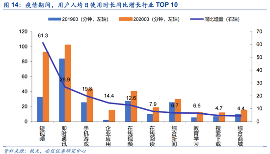 (3) 在线娱乐—网络游戏/短视频/长视频:居家期间面对面接触减少,但居民互动及娱乐需求仍存,游戏、在线视频等板块将作为线上娱乐主要形式将有所受益。极光2020Q1互联网行业数据研究报告显示,受益于疫情,网络用户人均单日APP使用时长较同期增加2.4小时,短视频、手游及在线视频的人均日使用时长较同期分别增加61、20及13分钟。可重点关注三七互娱、完美世界、芒果超媒、腾讯控股、网易。